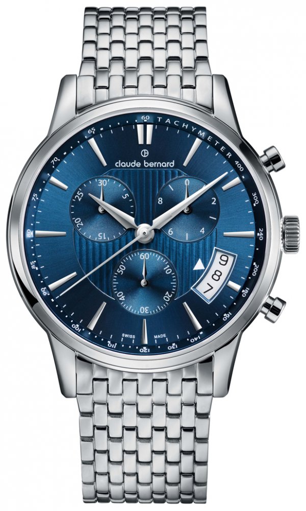 Con 42 milímetros de diámetro y potenciado por un confiable movimiento cronógrafo de cuarzo, la Blue Collection entrega un gran reloj a un magnífico precio, sello del fabricante de relojes Claude Bernard, fundado en el Jura, en Suiza, en 1973. La deslumbrante esfera cuenta con tres cronógrafos subcontadores, la ventana de la fecha situada a las 4 y un taquímetro en el realce. Con numerosas variantes, ya sea con la caja combinada en azul/dorado o azul/plateado con mallas de cuero o acero, esta colección azul deslumbra con legibilidad óptima en la muñeca y una poderosa y clásica declaración de los más finos estandartes de la relojería suiza.