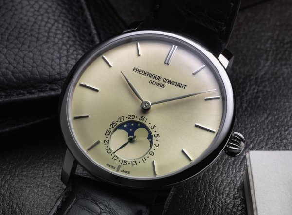 a Colección Manufacture es el orgullo y la satisfacción de la marca. Con más de 20 calibres manufactura en su catálogo, Frédérique Constant puede hacer valer definitivamente su condición de auténtica manufactura relojera, que le permite ofrecer una gama de relojes de alta calidad, bello diseño y un precio de lujo accesible. La distinción suiza se plasma en el ideal de atención a los detalles que impera en la elaboración de los movimientos manufactura, la alta calidad de los acabados y la elegancia de cada ejemplar. Ahora Frédérique Constant incorpora una nueva versión del Slimline Moonphase Manufacture.