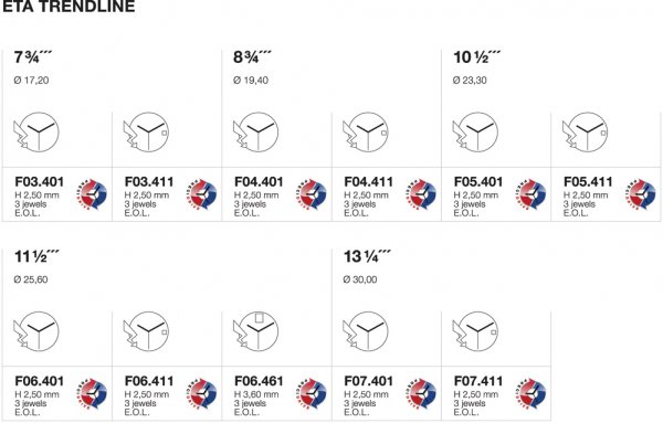 Esta precisión suprema firmada ETA FOX.xxx, está disponible en cinco tamaños de calibre desde 7 3/4 a 13 1/4, con o sin fecha. Estos movimientos ofrecen al comprador dos funciones suplementarias: almacenamiento de energía por encargo con opción de «parada de segundo», como así también un indicador E.O.L. de fin de vida de la batería. La tecnología integrada PreciDrive no ha cambiado en absoluto las dimensiones originales de la colección FOX.xxx, ya que la altura tradicional de 2,50mm o de 3,60mm ha sido conservada para proponer movimientos intercambiables con múltiples cajas. Este tamaño no limita la vida teórica de la batería que se extiende de 68 a 94 días, dependiendo el modelo.