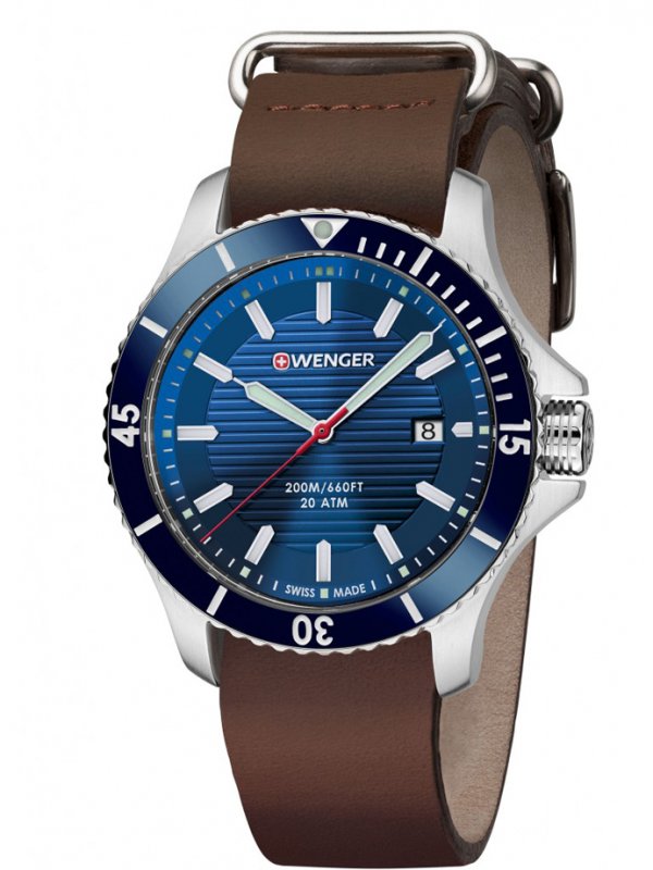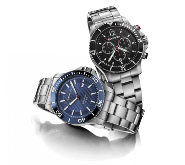 Wenger Seaforce se presenta en versión crono y 3 agujas, con correa de silicona con hebilla de metal o brazalete de metal con hebilla desplegable.