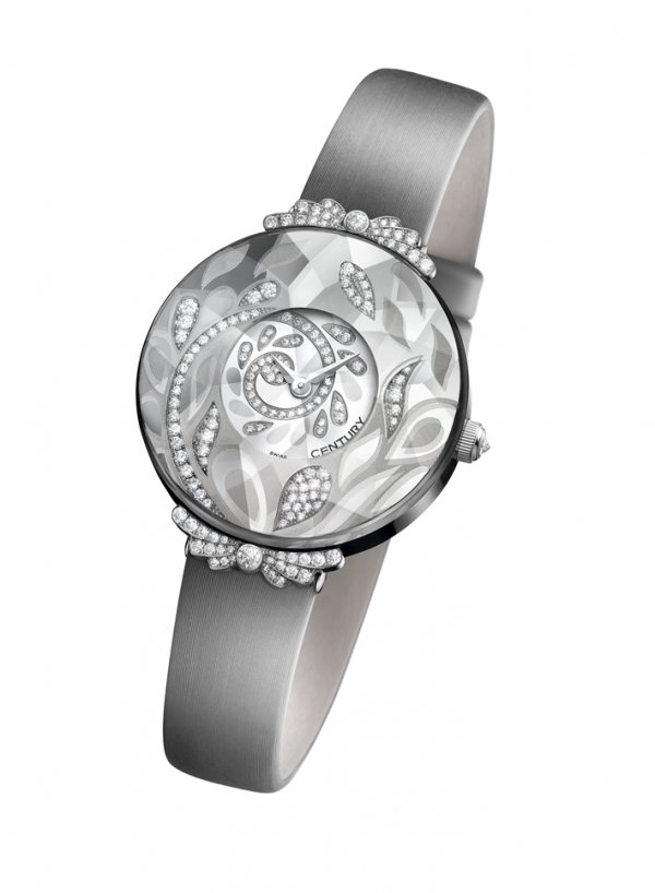 Inscripta dentro de la colección Temptation, que reúne las creaciones relojeras de excepción de Century, Primavera tiene la alegría de una flor que se abre y el glamour de una creación de alta costura. En su caja en zafiro Century perfectamente redonda, cuyas 56 facetas fueron talladas y pulidas a mano, flores y pétalos están de fiesta, con un profundidad únicamente posible por una arquitectura ornamental compleja. Los diamantes talla brillante engastados en el zafiro se reúnen con naturalidad con los diamantes de la esfera en oro blanco, con un efecto de espiral de un dinamismo particularmente logrado. Al brillo de las piedras preciosas responden las formas grabadas, casi flotantes, una sensación que resulta posible gracias a la técnica «Megalith». Este efecto de suspensión otorga a Primavera todo su misterio y elegancia, que se refleja en los brillos del zafiro, de los diamantes, pero también de los delicados pétalos pulido espejo. Este espectáculo particular se completa con un elegante brazalete en satín, y las astas de alma floral revestidas cada una con 25 diamantes.