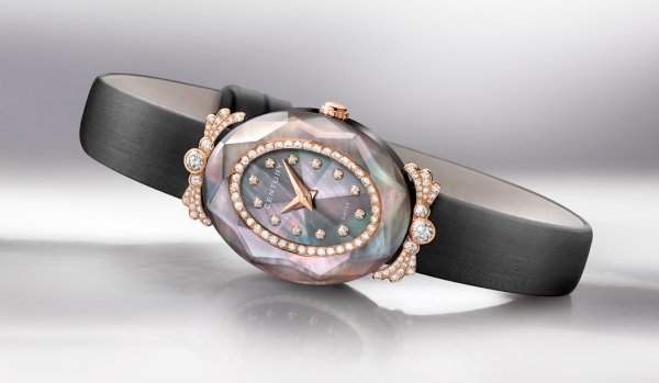 Para Versailles, los artesanos dieron nacimiento a una nueva técnica de construcción bautizada «Nacrilith», que permite contener entre dos zafiros Century, una capa de nácar. El efecto visual es de una alta elegancia cuando el nácar blanco o gris del cuadrante se prolonga bajo la totalidad de las 40 facetas de la caja de silueta ovalada. Un estilo bello que viene a resaltar los índices de diamantes, pero también el ribete interior de 40 diamantes talla brillante de este reloj inscripto en la colección Precious Elegance, consagrada a los modelos de lujo ya clásicos de Century. Con sus astas en oro 18 quilates, blanco o rosa, también engastadas con diamantes, la luz del oro, el efecto tornasolado del nácar acariciado por todos los reflejos del zafiro Century: he aquí un espectáculo tan impactante como el contraste con el rigor de un brazalete en satín negro, guardando el espíritu de la alta costura.