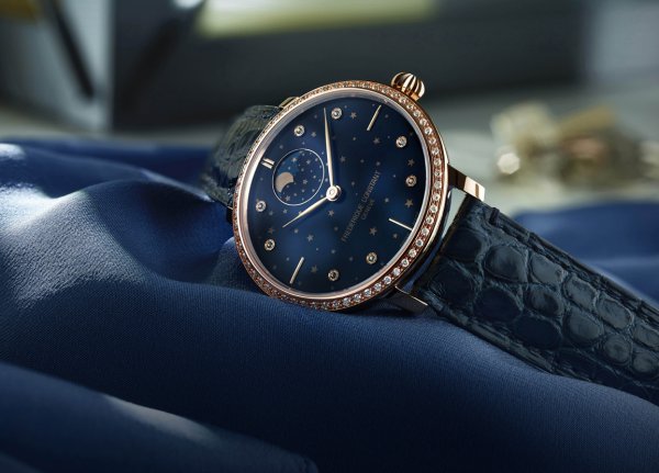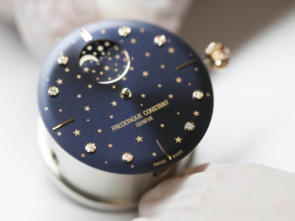 Como es costumbre en Frédérique Constant, la marca introduce una novedad que combina a la perfección elegancia y técnica relojera, proponiendo un reloj con una complicación de fase lunar y que presenta unos complejos acabados y un bisel engastado con diamantes. Está disponible con caja de 38,8 mm de acero enchapado en oro rosa y 60 diamantes (0,5 quilates) engastados alrededor del bisel.