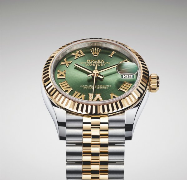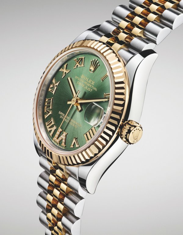 R olex lanzó este año dos nuevas modalidades de su Oyster Perpetual Datejust 31: una en versión Rolesor amarillo (combinación de acero Oystersteel y oro amarillo de 18 quilates) y la otra en versión Rolesor Everose (combinación de acero Oystersteel y oro Everose de 18 quilates). La primera modalidad presenta una esfera verde oliva con acabado tipo sol y agujas y números romanos en oro amarillo de 18 quilates con el VI engastado de once diamantes, mientras que la segunda luce una esfera en color rosé con acabado tipo sol y agujas y números romanos en oro rosa de 18 quilates.