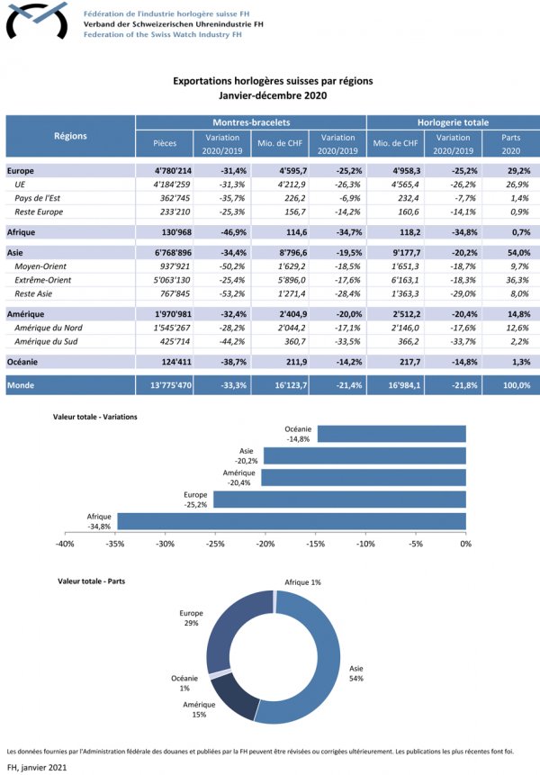Azotadas fuertemente por las consecuencias de la pandemia mundial del año pasado, las exportaciones relojeras suizas sufrieron una fuerte caída en relación a 2019.