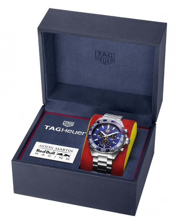 TAG Heuer lanza una edición especial del cronógrafo Fórmula 1 con los colores azul, rojo y amarillo del Aston Martin Red Bull Racing RB16 Car, para celebrar la alianza con la escudería.