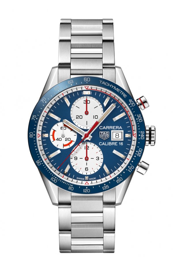 Hoy, TAG Heuer presenta dos relojes nuevos con apariencia vintage y gran elegancia dentro de la colección TAG Heuer Carrera Calibre 16 con un diámetro de 41mm: un modelo en color negro con correa de piel negra y otro modelo en color azul con pulsera de acero. Los toques en rojo, los colores, los contrastes y la distribución de los contadores son claras referencias al deporte automovilístico.