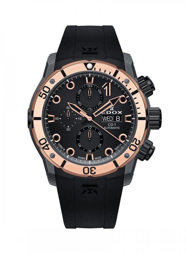 Disponible en cuatro variantes de colores: Negro/Azul; Negro/Rojo; Negro/oro Rosa o Negro sobre Negro, todos presentan la parte posterior de la caja transparente que permite una vista completa del movimiento. El Edox Automatic Chronograph Carbon es otro súper ejemplo de precisión de los relojes Edox.