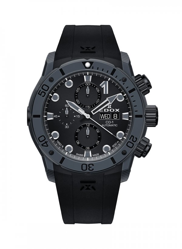Calibre: Edox 011. Caja: Caja de acero inoxidable 316L, Ø: 45 mm con recubrimiento de carbono. Nuevo diseño de bisel de cerámica para buceo. Hélice de lancha grabada en el dorso de caja. Corona Edox y/o pulsador con doble cierre (sistema O´ring). Válvula de hélio automática situada a las 9. Cristal de zafiro irrayable y antirreflejo, de 3 mm de espesor. Fondo transparente. Sumergible: 500 metros. Correa de caucho con logo Edox en la hebilla desplegable.