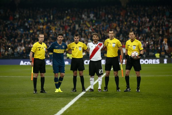 Árbitros de la Conmebol Libertadores, todos equipados con los relojes TAG Heuer Connected, junto a Pablo Pérez y Leonardo Ponzio, capitanes de Boca y de River Plate respectivamente.