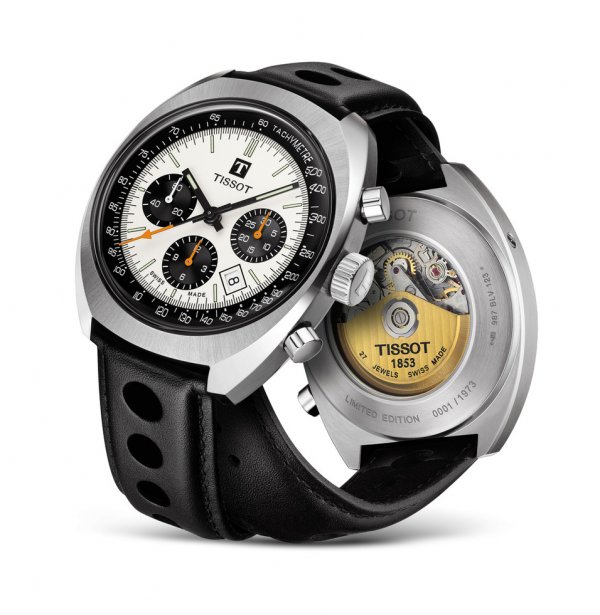 El Tissot 1973, fiel al espíritu de los relojes de competición de la década de 1970, es un cronógrafo con forma de cojín oval con líneas combadas en sus tres dimensiones. Su cristal de tipo box está tallado en zafiro. La aguja de los segundos y la del cronógrafo se visten de color naranja; las de las horas y los minutos son agujas tipo bastón rectangular con remate blanco en la punta. La esfera plateada contrasta con los contadores y el realce tacómetro de color negro, lo que crea un efecto estilo panda. La correa de becerro negro pespunteada es una reproducción del modelo que Tissot inventó y patentó en la década de 1960, caracterizado por sus orificios grandes. Esas perforaciones recuerdan al volante de los coches de carreras de la época.