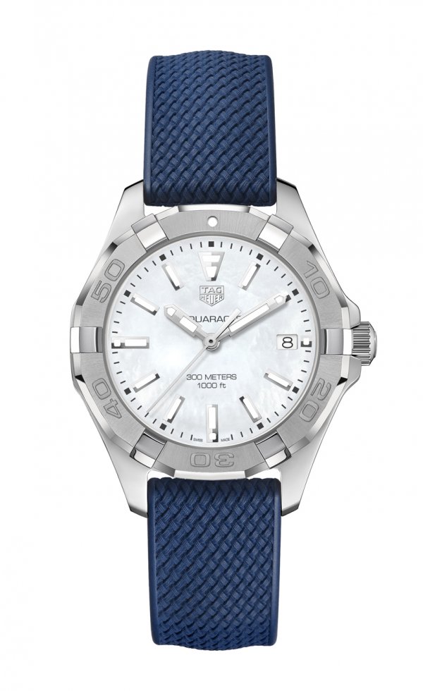 El aspecto más llamativo de los nuevos modelos Aquaracer de 35 mm es el toque de azul, un tono profundo y encantador que evoca sensaciones de días pasados felices relajándose en un yate. La esfera azul tiene un efecto reflectante de rayos de sol y un patrón grabado de ondas de arena que recuerda a las suaves olas que bañan las costas arenosas de una playa tropical. Los modelos de acero inoxidable con una esfera azul se presentan con pulsera de acero inoxidable o correa de caucho en el mismo tono azul. El patrón de trama cruzada en la correa imita la textura de las cuerdas de vela, un toque que resalta su pedigrí marino. La correa de caucho es ideal para practicar deportes acuáticos porque es duradera, cómoda, ligera e impermeable. El tercer modelo de la colección tiene una elegante esfera de nácar y también se presenta con una correa de caucho azul. Los tres modelos cuentan con fechador a las 3 h en la esfera.