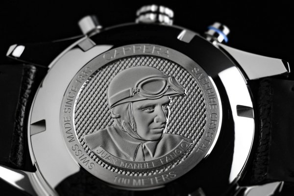 El retrato de Juan Manuel Fangio está estampado en el fondo de la caja de acero atornillado junto al número de edición limitada.