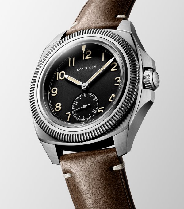 La curvatura de la forma en cojinete de su caja enfatiza su diseño único, registrado el 1 de abril de 1935 en la Oficina Nacional de la Propiedad Industrial en Berna (Suiza). Aunque estaba destinado a la aviación, este reloj ya logró conquistar a un público general en busca de un reloj fiable, sólido, preciso y de lectura fácil. El nuevo Longines Pilot Majetek incluye características técnicas y ergonómicas totalmente renovadas. Se han revisado sus proporciones, su forma original con el cojinete ligeramente arqueado y sus cantos más redondeados para responder a las tendencias actuales. Su diámetro de 43 mm hace que sea cómodo de llevar. A las 9, el exterior de la caja de acero con fondo atornillado incluye una placa conmemorativa que reza «1935». Remite a la fecha original del primer modelo Longines «Majetek», y esconde un mecanismo de engranajes patentado de nuevo. El sistema de bisel giratorio externo acanalado garantiza una estanqueidad de hasta 10 bares (100 metros) acoplado con un triángulo de referencia móvil fluorescente, o «Starting time indicator». Este se encuentra bajo el cristal de zafiro, aunque es independiente, y se sitúa por encima de la esfera. En el modelo de 1935, bisel y cristal con referencia incluida giraban como bloque único. Hoy, el cristal de zafiro se queda fijo y contribuye a la estanqueidad de la nueva caja.